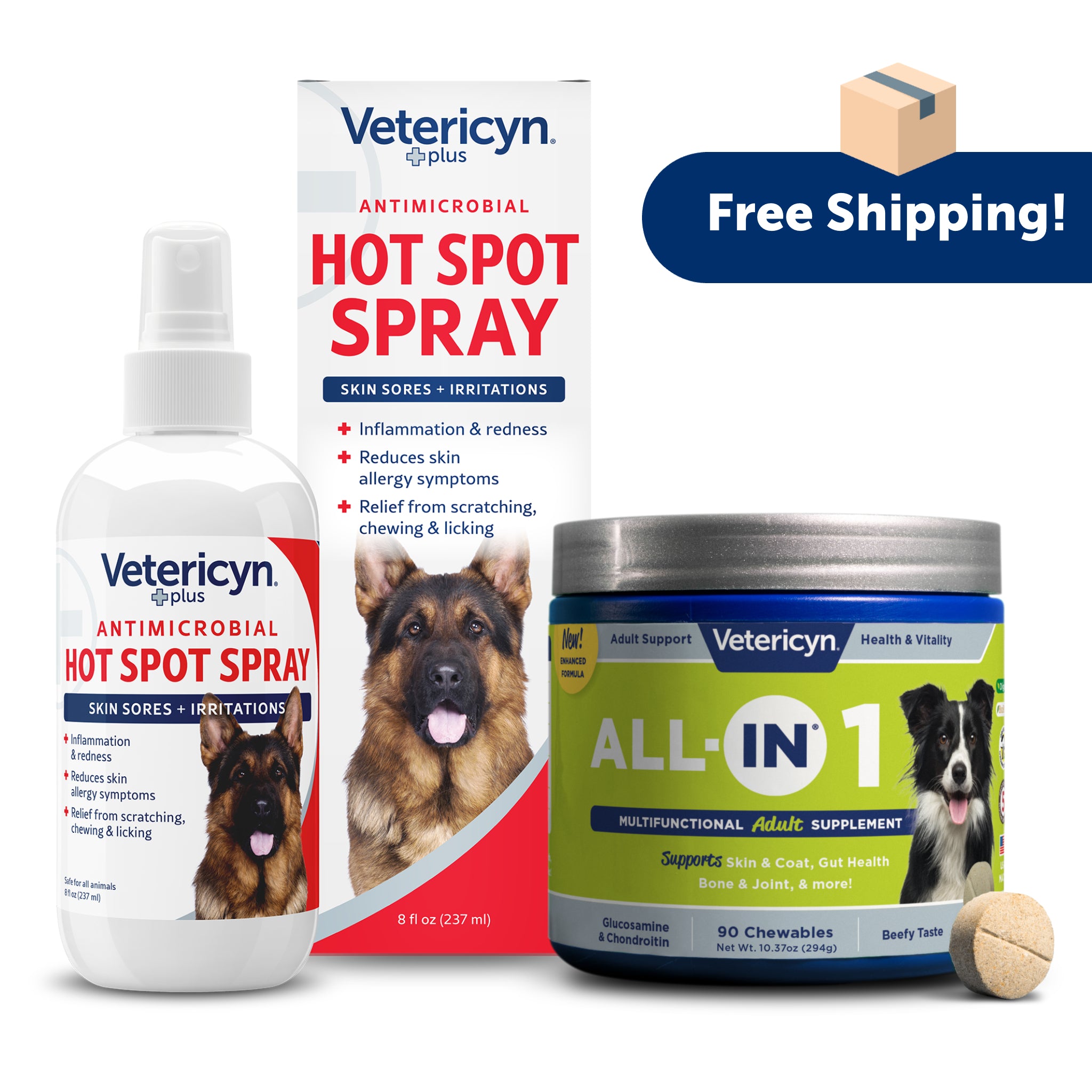 Care for your dog from the inside out with Vetericyn's ALL-IN 1 Multifunctional Dog Supplement and Hot Spot Spray combo.