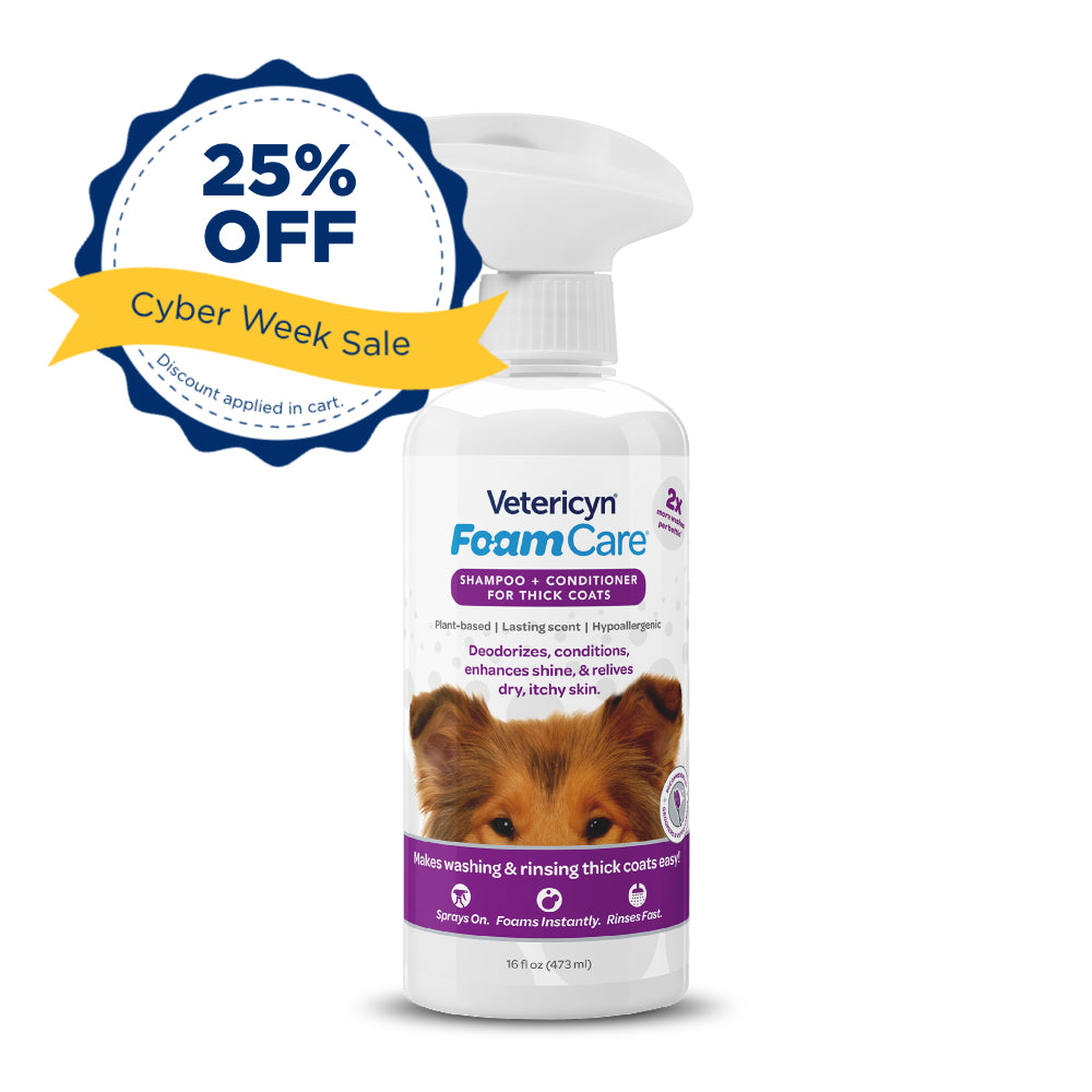 Wet your pet with warm water thoroughly. Spray Vetericyn Foam Care evenly on your pet and lather shampoo into their coat. Rinse thoroughly.