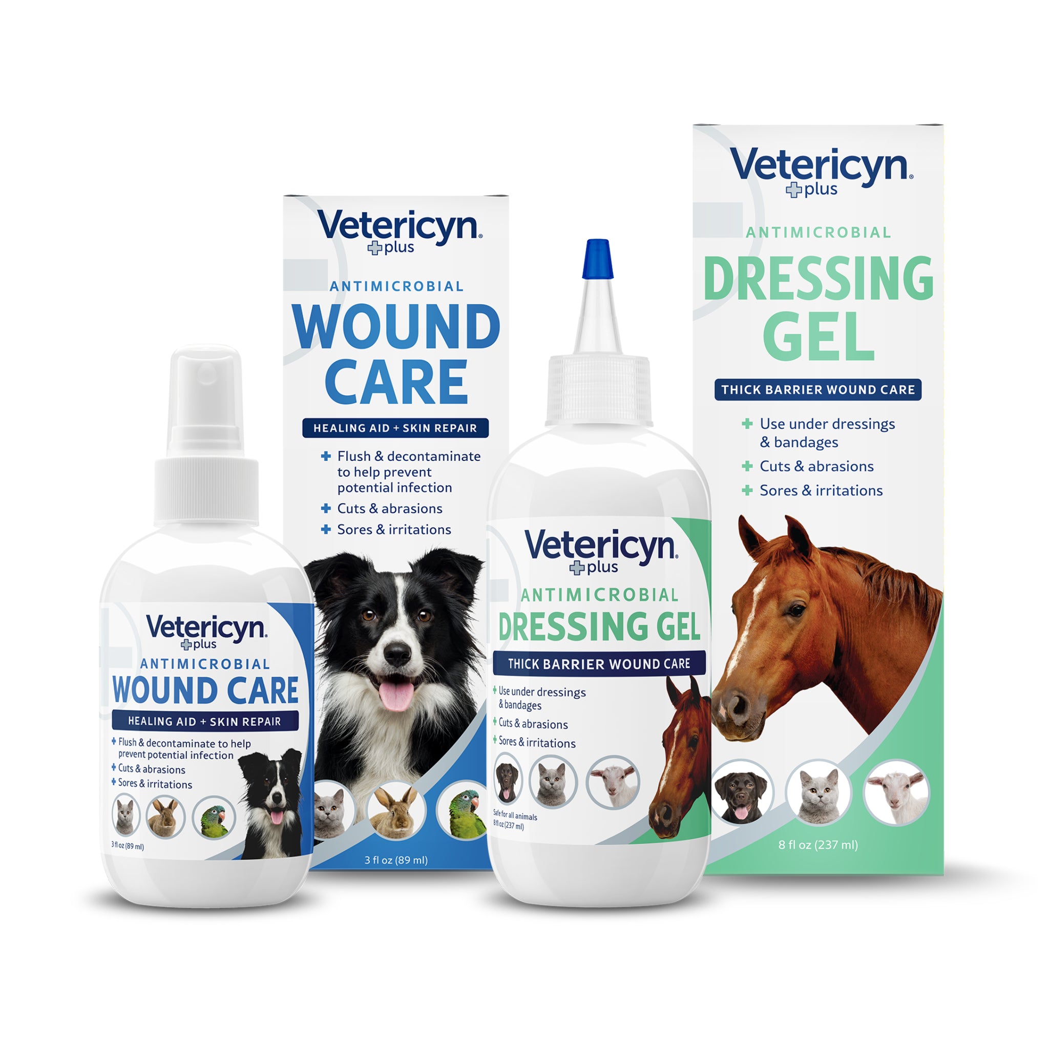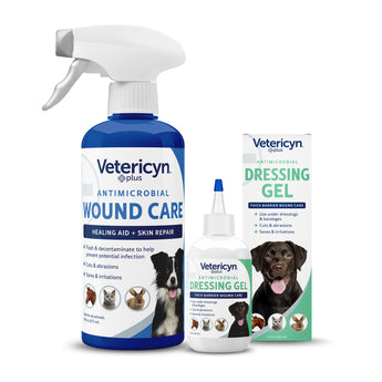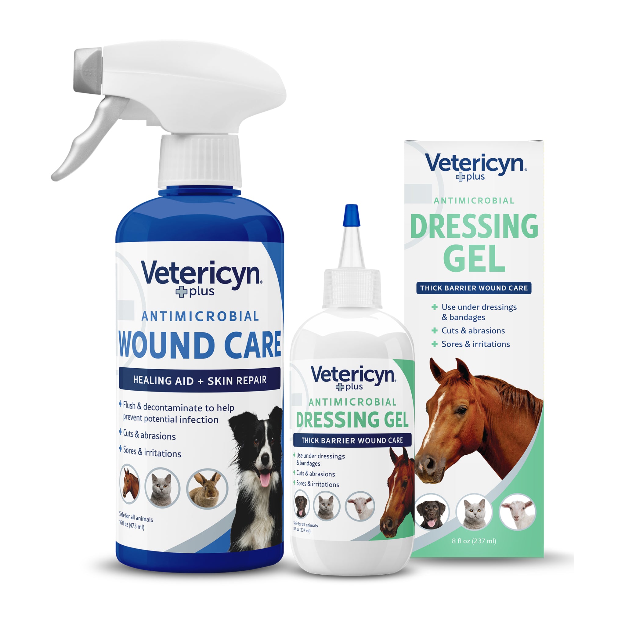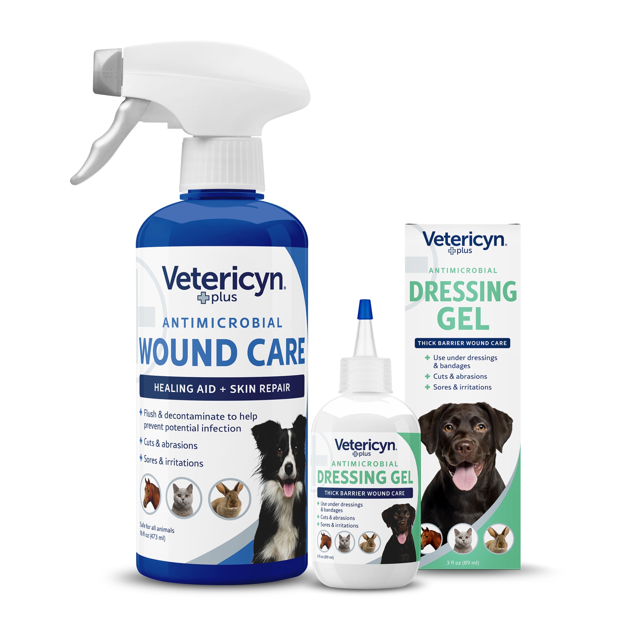 Support faster, safer healing with the Vetericyn Plus Wound Care Bundle — a convenient two-step solution for pet wound care and skin recovery. This bundle includes Vetericyn Plus Wound Care Spray and Vetericyn Plus Wound Dressing Gel, formulated to clean wounds, protect damaged skin, and promote optimal healing for dogs, cats, and other animals.